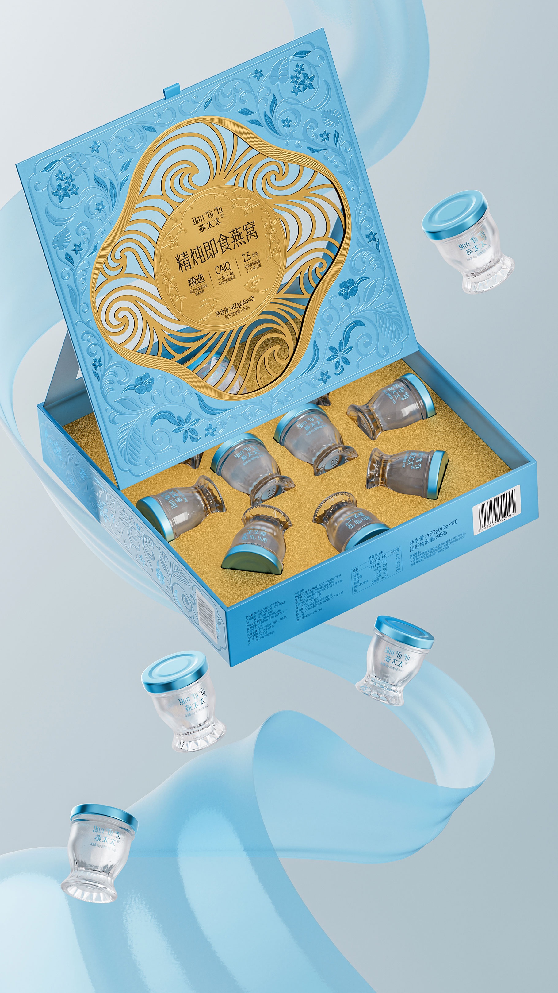 整體包裝創(chuàng)意以獨創(chuàng)三層視覺敘事:中部采用東方園林“框景”手法打造鏤空視窗,湖藍(lán)色藤蔓紋樣層疊延展,再現(xiàn)雨林生態(tài)的呼吸韻律,虛實交錯間透現(xiàn)燕窩瑩潤質(zhì)感。