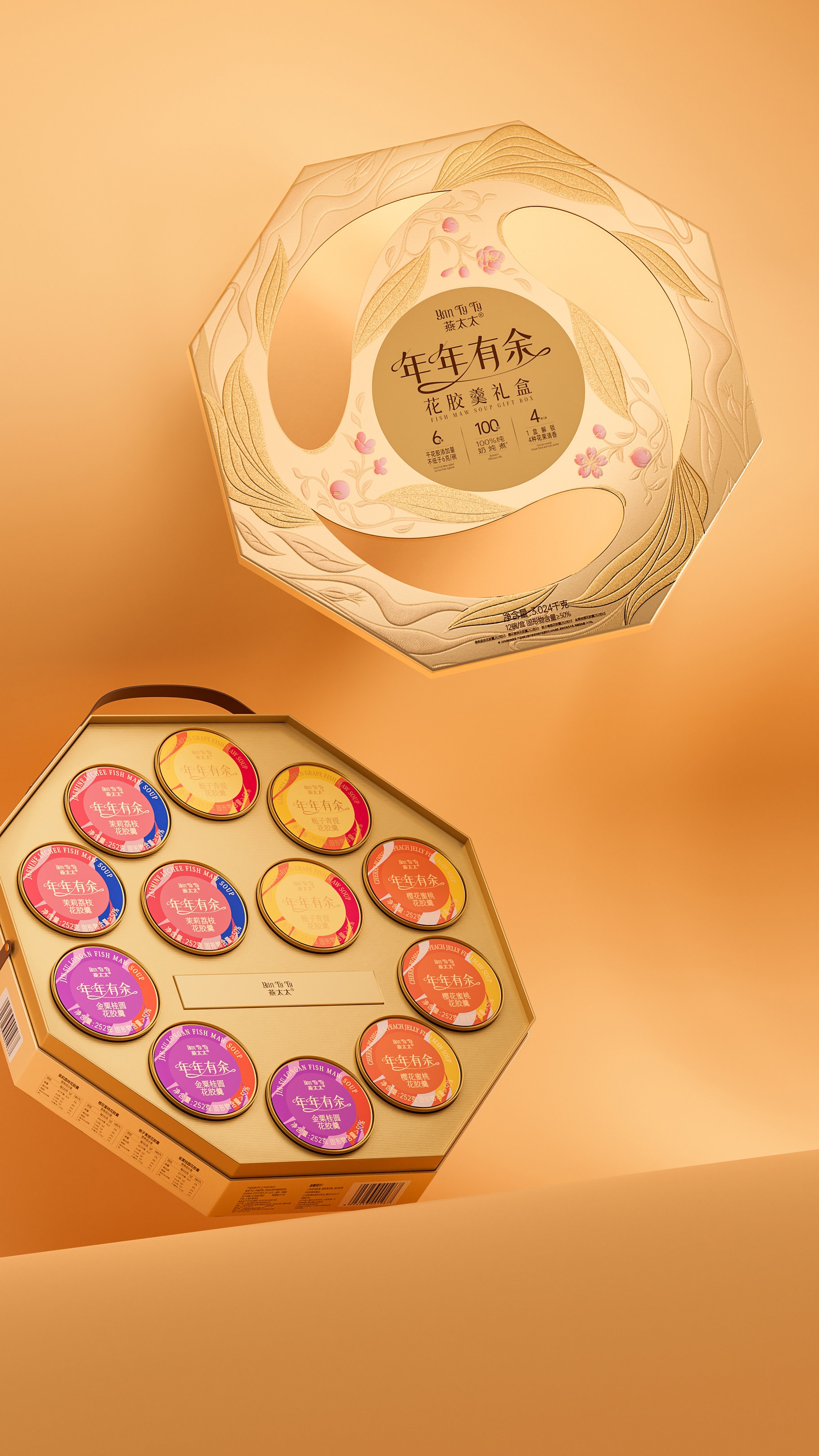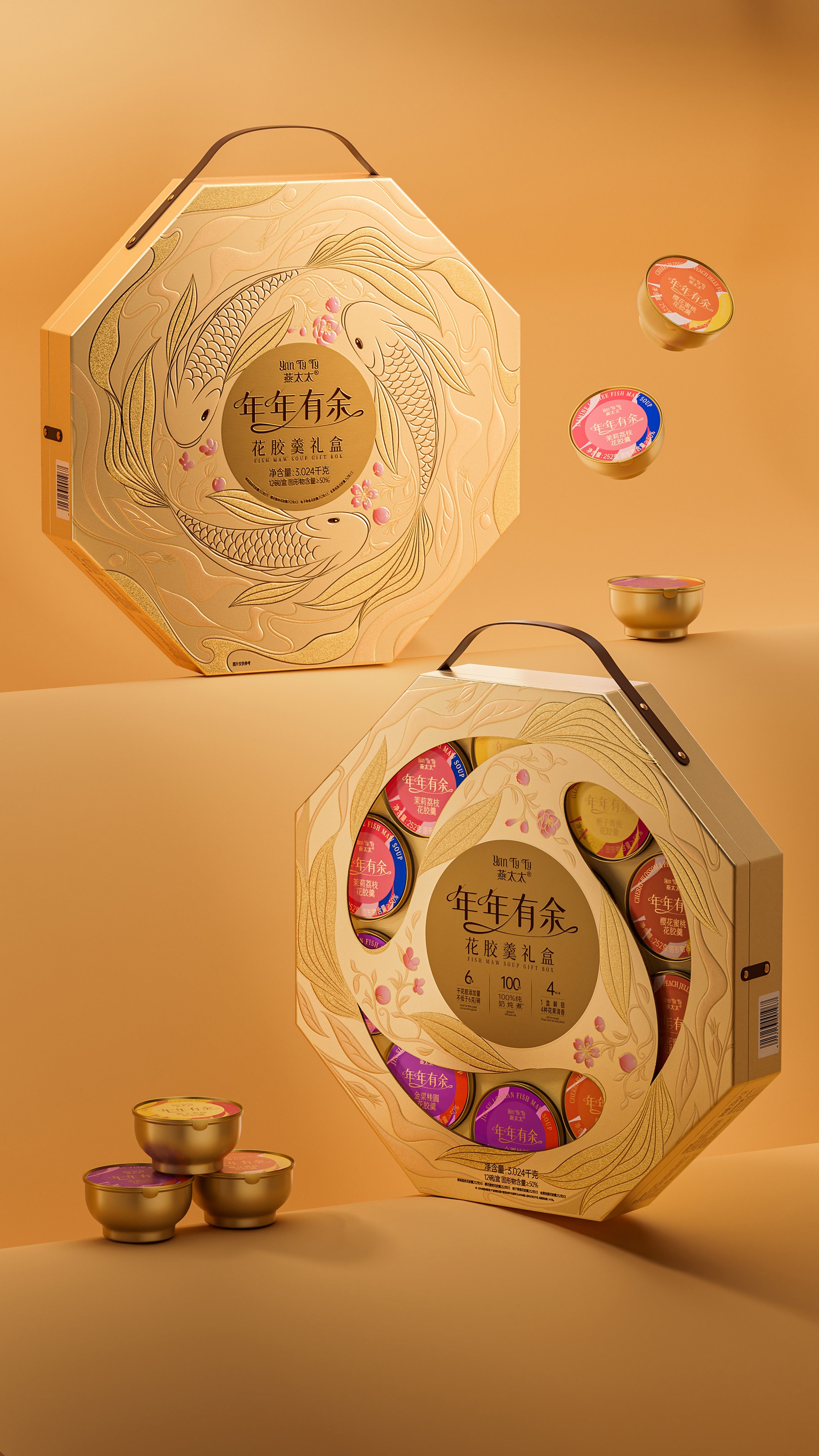 燕太太為山姆會員店精心專供的新年花膠羹禮盒產(chǎn)品,團隊在思考新年禮盒產(chǎn)品的時候,旨在通過一款獨特而富有深意的包裝設計,傳達出對美好未來的期許與祝福。此設計以“年年有余”為主題,巧妙融合魚與不同口味主題花卉的元素,通過完美旋轉的圖案創(chuàng)意,打造出一款既體現(xiàn)傳統(tǒng)韻味又不失現(xiàn)代美感的新年花膠羹禮盒。